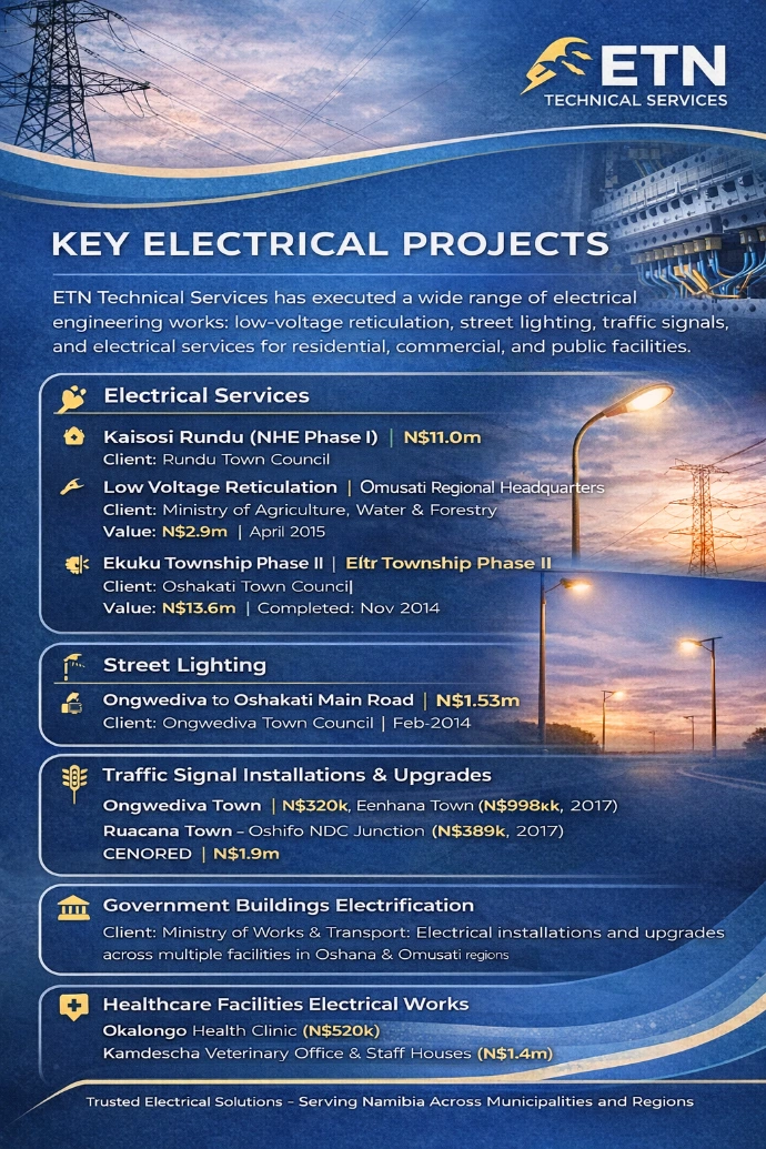 ETN Technical Services CC has an extensive track record of successfully delivering electrical, civil, construction, and infrastructure projects across Namibia. Established in 2008, the company has worked with government institutions, local authorities, state-owned enterprises, consulting engineers, architects, and private-sector clients. Our portfolio reflects technical excellence, compliance with national standards, and a commitment to delivering projects on time and within scope.